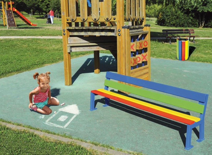 Najwyższej jakości ławka stworzona z myślą o przedszkolakach: - ławka ma obniżoną wysokość siedziska do 270mm - długość 1500mm - stelaż: żeliwny, malowany na powierzchni cynku Ral 5010 - siedzisko i oparcie z drzewa egzotycznego , malowane na różne kolory: czerwony, żółty, zielony, niebieski - montaż przez przykręcenie na płytach