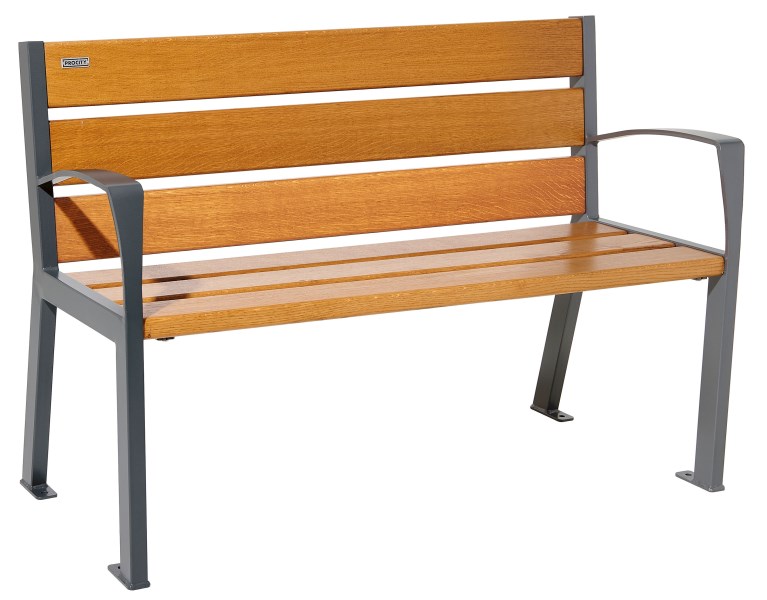 Ławka Silaos z podłokietnikami - seria prostych ławek wykonanych z wysokiej jakości materiałów. Posiadają stalowe stelaże. Siedzisko oraz oparcie wykonane są z drewna debowego o grubości 33mm certyfikowanego PEFC. Idealne wyposażenie dla restauracji, barów, kafejek, ogródków.